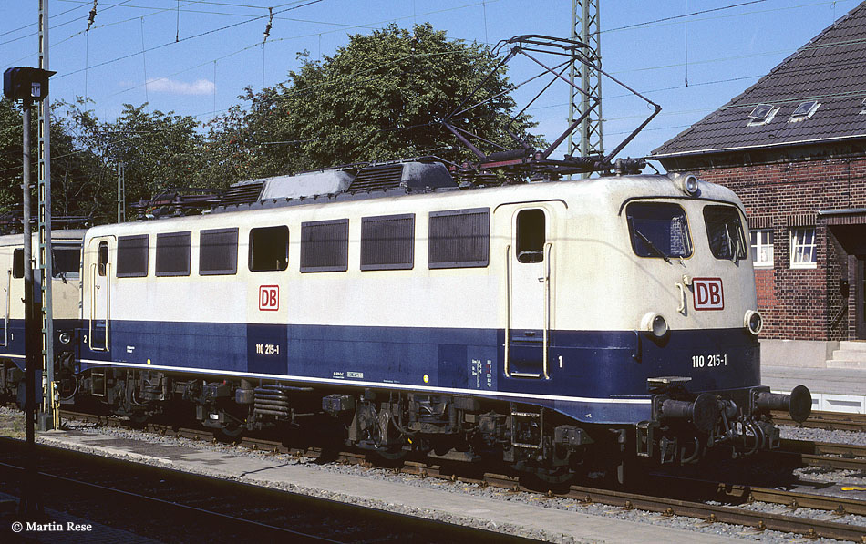 | Ihre letzten Jahre verbrachte die 110 215 beim Bw Dortmund. Aus dieser Zeit stammt die Aufnahme der Lok. Münster Hbf, 22.7.1998 | |