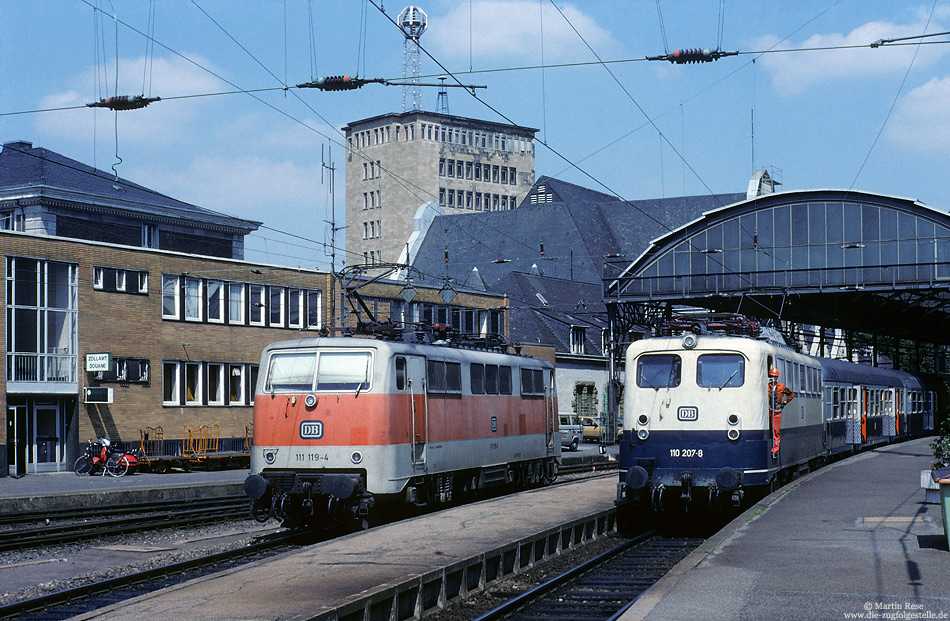 | Am 11.7.1990 habe ich in Aachen Hbf die Dortmunder 110 207 neben der Düsseldorfer 111 119 fotografiert. Während die 110 inzwischen verschrottet wurde, kann man die 111 119 regelmäßig in Aachen antreffen. | |