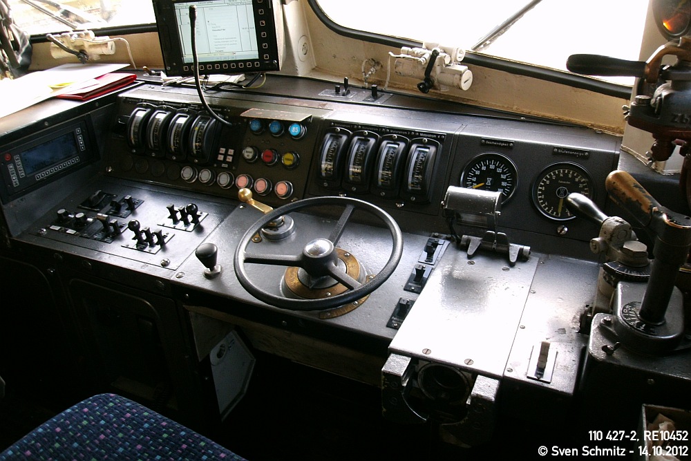 | Führertisch der 110 427-2 kurz vor Abfahrt des RE10452 von Düsseldorf in Richtung Aachen. | |