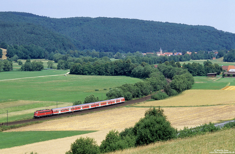 | Im Dezember 2006 übernahm die "cantus-Verkehrs mbH" die Nahverkehrsleistungen zwischen Kassel und Fulda und verdrängten hier die Frankfurter 110. Mit dem RE25513 (Kassel - Fulda) fährt die 110 405 bei Neuenkirchen durch das Haunetal. 20.7.06 | |