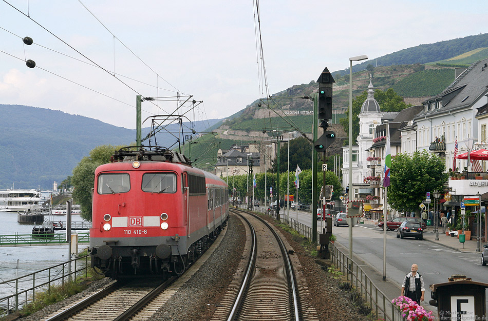| Anlässlich des Fristablaufs gibt es ein weiteres Foto der 110 410 von mir: Auf derr Fahrt über die rechte Rheinstrecke begegnete mir in Rüdesheim die Frankfurter 110 410 mit der RB 15519 (Koblenz - Wiesbaden). 2.9.2007 |