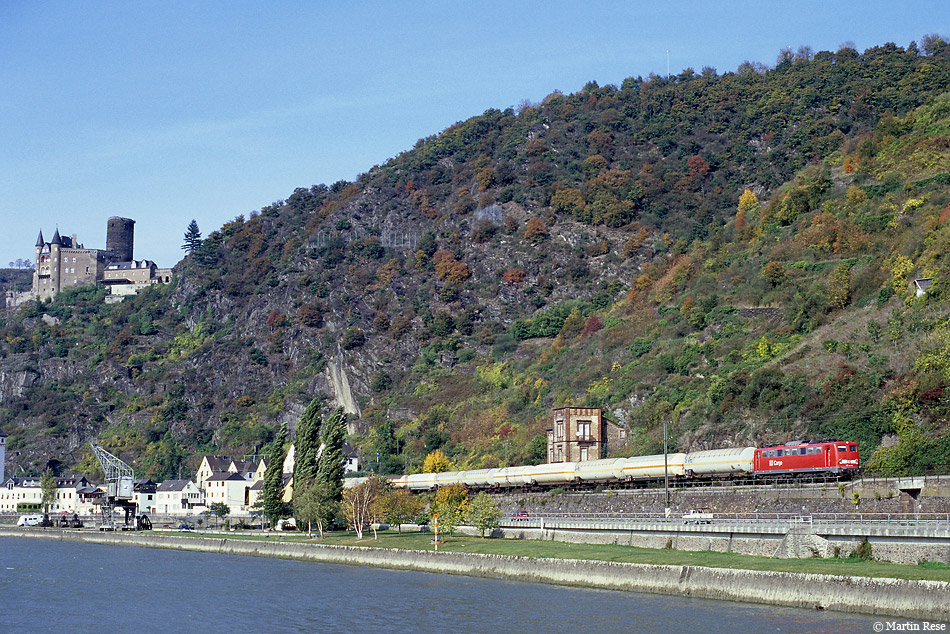 | Die Tage der Baureihe 150 waren Ende 2002 bereits gezählt! Am 10.10.2002 fährt die 150 157 mit dem Flüssiggaszug 47682 aus Gladbeck West nach Kehl, fotografiert bei St.Goarshausen. |