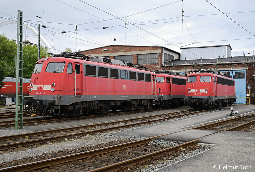 | Am 01.05.2013 kam es nochmals zu einer scheinbar alltäglichen Szene, wie sie im Bw Köln-Deutzerfeld über fünf Jahrzehnte zu beobachten war. Nach Abstellung aller 110er bei DB-Regio in NRW, waren es aber nur noch die abgestellten 110 436, 431 und 437, die vor der Ellokwerkstatt auf ihre Überführung, zum Schrotthändler nach Eschweiler-Aue warten. | |