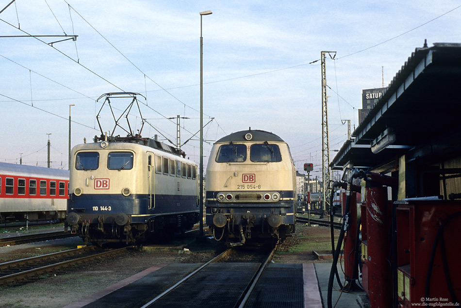 | Am Nachmittag des 25.3.1998 begegneten sich die Kölner 110 144 und 215 053 in Köln Bbf. Seiner Zeit war in Köln Bbf noch die Tankstelle in Betrieb. | |
