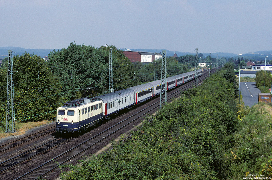 | Am 14.8.1997 war die Hamburger 110 137 im Kölner 110-Umlauf unterwegs und passierte mit dem D426 (Köln - Oostende) den Bahnhof Sindorf. In Aachen wird eine Belgische Gleichstromlokomotive diesen Zug übernehmen. | |
