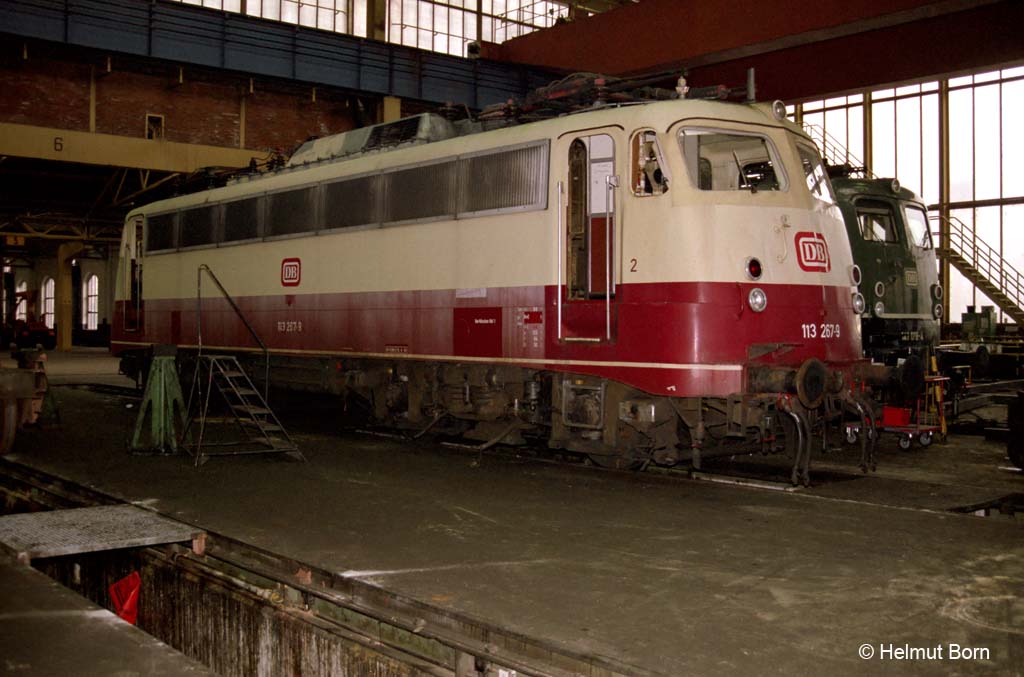 gearbeitet. Wie für diese Zeit üblich wird die Lackierung nur teilweise ausgebessert, so dass die Lok das AW mit einer „Flickenteppich-Lackierung“ verlassen wird.