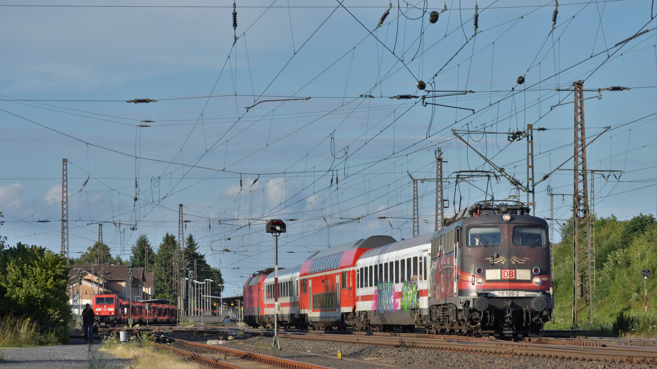 | 115 509 ist am 20.07.17 mit PbZ 2487 auf der Kinzigtalbahn unterwegs. Hier bei Flieden erwischte ich sie im schönsten Abendlicht. Angehängt waren 2 IC-Waggons, 1 Doppelstockwaggon und 120 118. | |