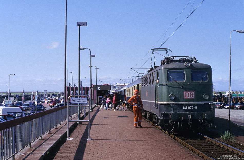 | In Norddeich Mole wurde soeben der mit der designierten Museumslok 141 072 bespannte SE3165 nach Helmstedt bereit gestellt. 14.7.1996 | |
