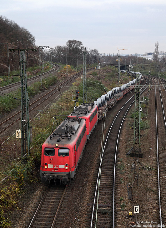 | Mit vereinten Kräften ziehen die 140 805 und 140 833 einen "Rollmopszug" von Oberhausen West nach Andernach, fotografiert bei Köln West am 14.12.2015. | |