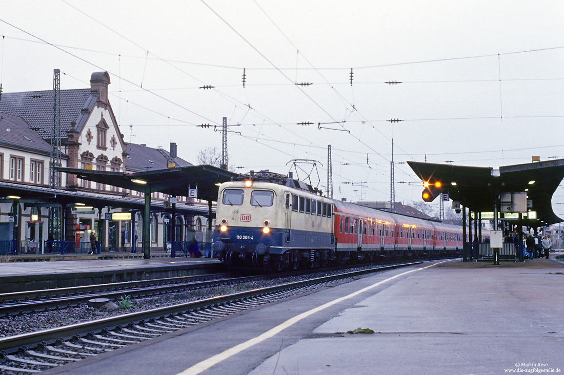 | Zur blauen Stunde legt die Saarbrücker 110 209 am 18.12.2000 mit dem SE23037 (Saarbrücken - Offenburg) in Rastatt einen kurzen Halt ein. | |