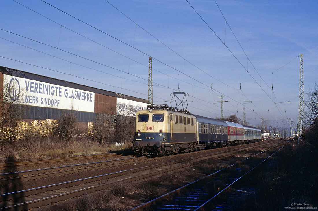 | Mit dem Rbz74237 (Köln Deutzerfeld - Aachen - Neuss - Düsseldorf Abstellbahnhof) am Haken durchfährt die Dortmunder 141 159 am 21.1.2000 den Bahnhof Sindorf. | |