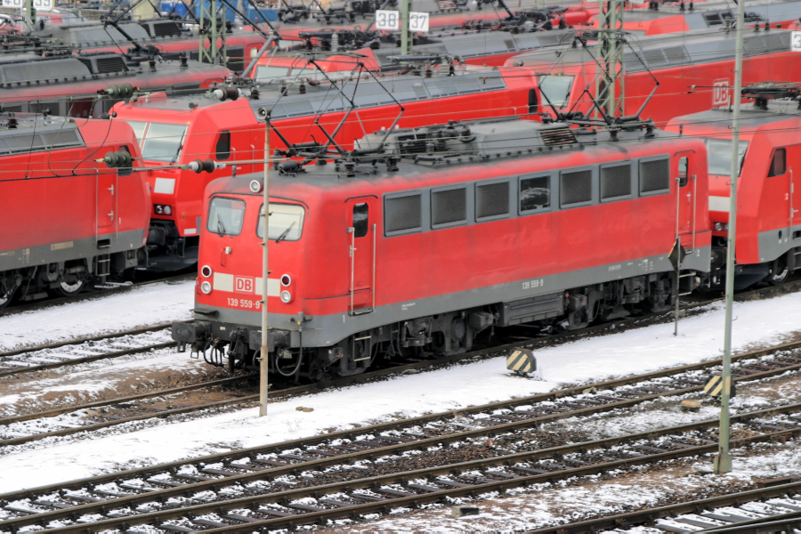 am 06.03.2005 auf der östlichen Seite der Fahrzeughalle des Bw. Mannheim, aufgenommen vom Steg über das Betriebsgelände aus.