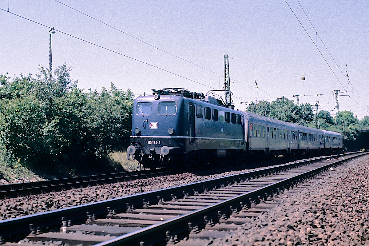 | Die 110 154 mit drei "Silberlingen" am 13.07.1986 auf der Fahrt von Mannheim nach Heidelberg in Höhe Heidelberg-Wieblingen | |