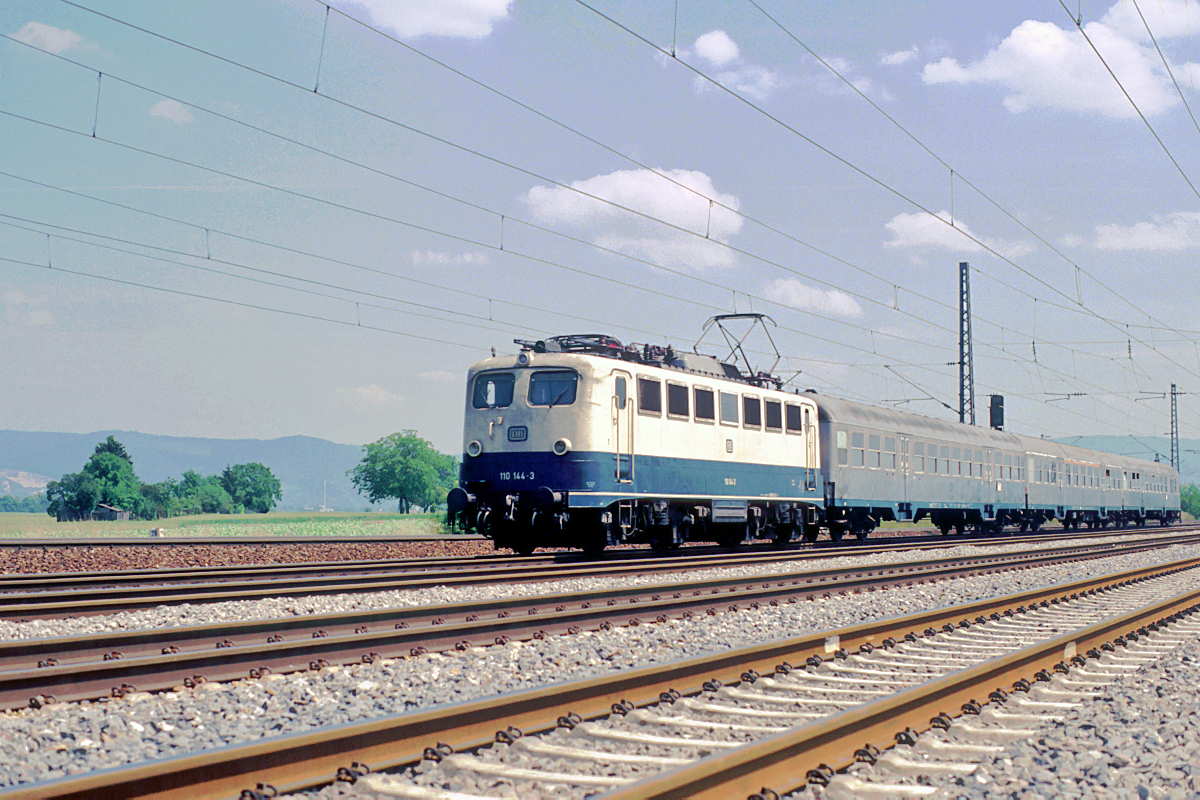 Ein Nahverkehrszug am 19.06.1990 auf der Strecke zwischen Heidelberg und Mannheim-Friedrichsfeld, gezogen von der blau/beigen