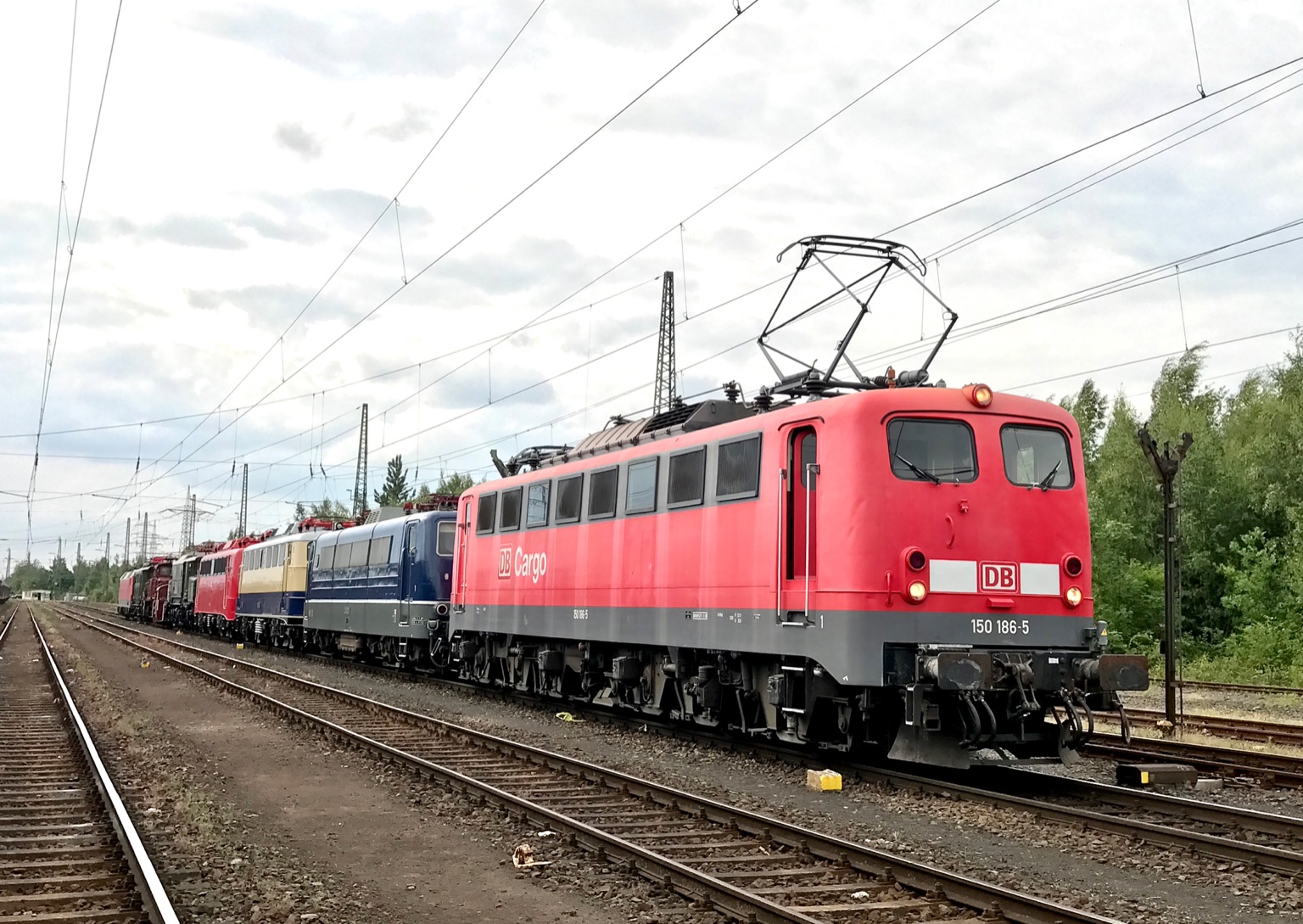 | Museumslokomotive bei den Vorbereitungen der Fahrzeugparade des Sommerfestes im DB Museum Koblenz-Lützel. Am Haken hängen 181 001, E10 1239, 110 152, E93 07, E60 10, E44 002 und eine unbekannt gebliebene 120. (c) Dominik Weinkopf | |