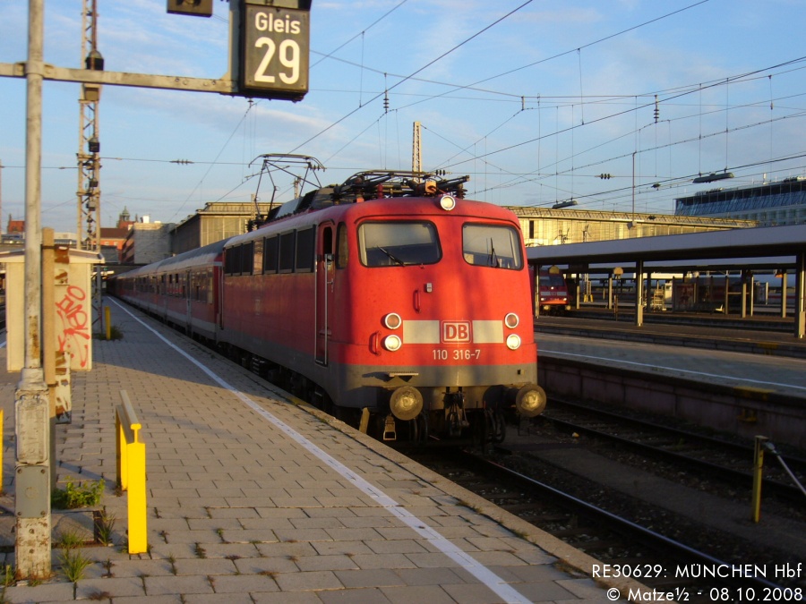 | Im Herbstlicht des Oktobers 2008 wartet die 110 316-7 mit dem RE30629 am Haken auf Ausfahrt von Gleis 29. Ziel des Zuges ist Garmisch-Partenkirchen. | |