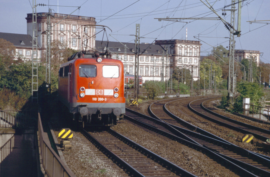 am 09.10.2002 mit einem Nahverkehrszug in einer großen Kurve den Mannheimer Hbf. verlassen und fährt gleich über die Rheinbrücke nach Ludwigshafen.