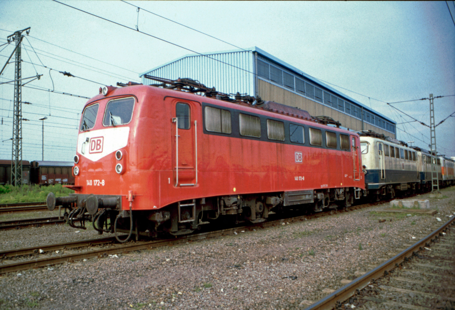 Vor zwei blau/beigen 140er und einer ganz im Hintergrund erkennbaren unbekannten grau/orange lackierten Lok steht die