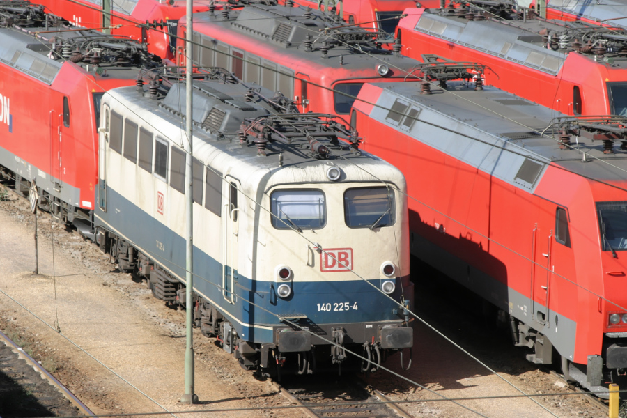 | Als nach der blauen bzw. grünen Periode die ersten blau/beige Loks auftauchen, wurde diese Lackierung von den Eisenbahnfreunden spöttisch belächelt. Heute sind sie ein "wohltuender" Anblick inmitten des verkehrsroten Einerleis. Die Aufnahme der 140 225 entstand am 03.10.2004 im Bw. Mannheim. | |