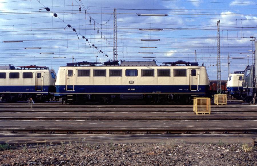 | Ausgesprochen freundliches Fotowetter war am 25.05.1990 bei der Aufnahme der blau/beigen 140 243 im Bw. Mannheim | |