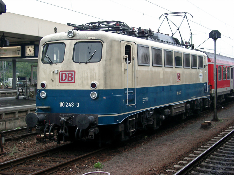 | Auf dem Durchfahrtsgleis 6 im Mannheimer Hbf. steht am 29.08.2002 die blau/beige 110 243. Keine drei Monate später wurde sie verkehrsrot umlackiert. | |