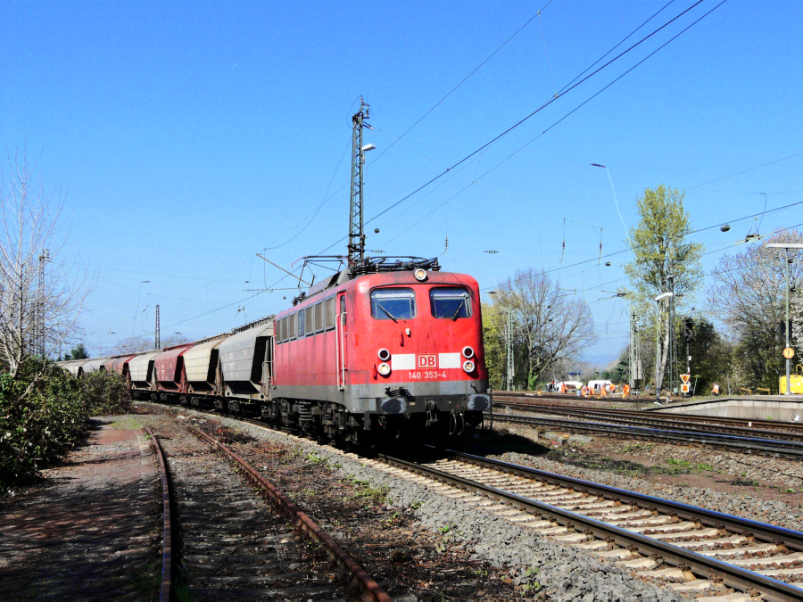 in Mainz-Bischofsheim mit einem Güterzug um die Kurve.