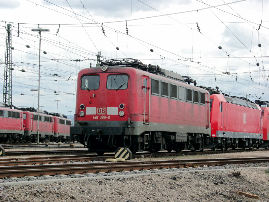 | Zusammen mit weiteren Loks der BR 140 und 185 steht 140 369 am 09.04.2006 im westlichen Bereich des Rbf. Mannheim. | |