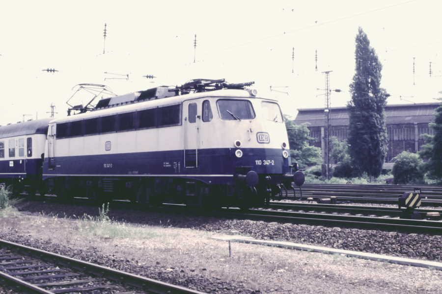 | 110 347 mit einem D-Zug aus Heidelberg nähert sich am 10.06.1988 in Höhe "Neckarauer Übergang" dem Hbf. Mannheim. | |