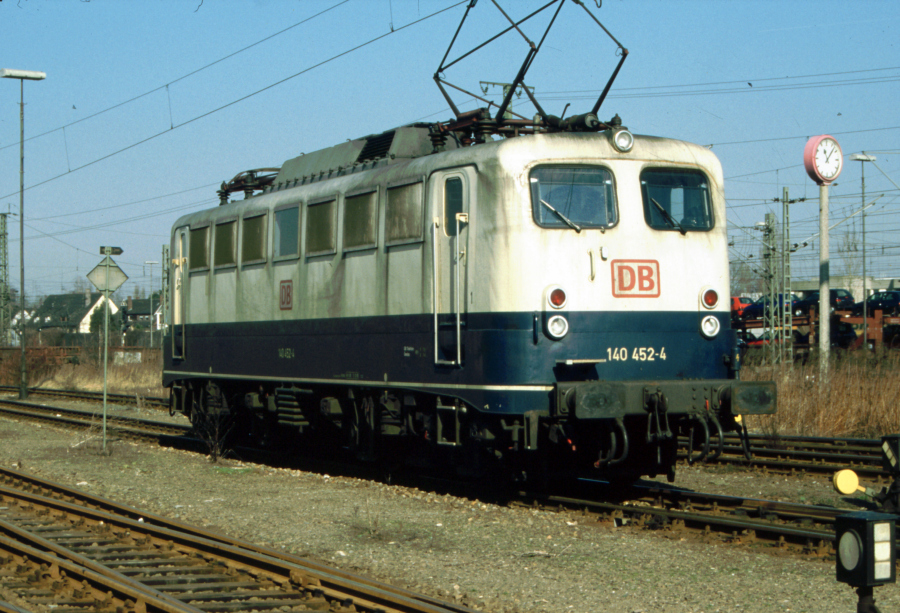 | 140 452 am 02.03.1997 bei der Ausfahrt aus dem westlichen Vorfeld des Bw. Mannheim in Höhe Mannheim-Neuhermsheim. | |