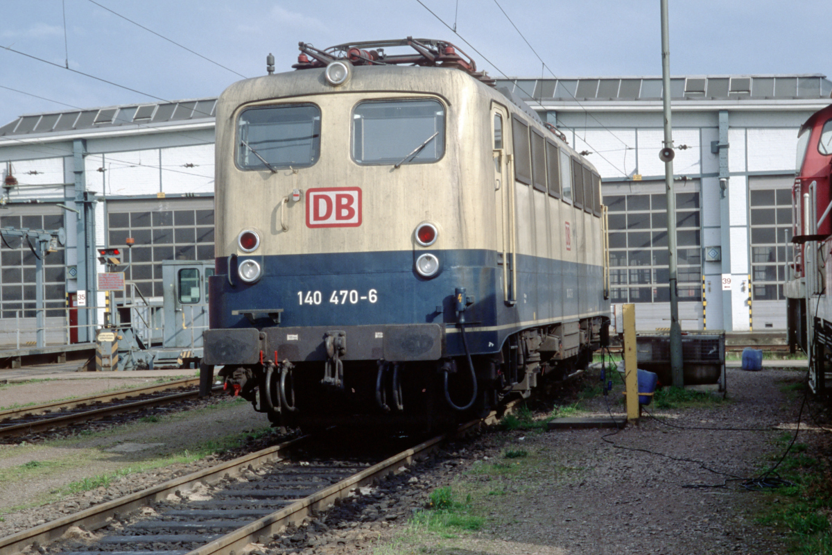 | 140 470 in blau/beige am 15.04.2000 vor den großen Hallentoren des "Lokschuppens" im Bw. Mannheim. | |