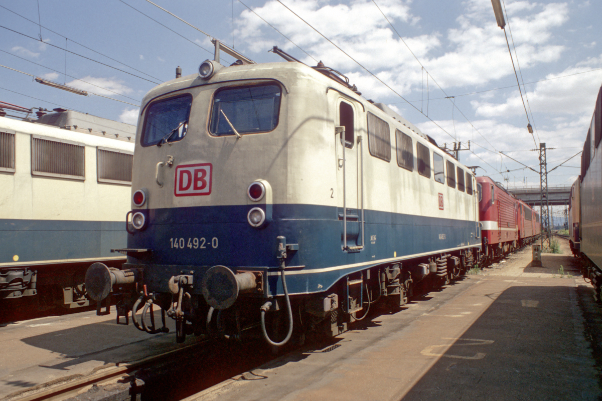 | 140 492 in blau/beiger Lackierung am 21.07.1996 vor der östlichen Schiebebühne des Bw. Mannheim. | |