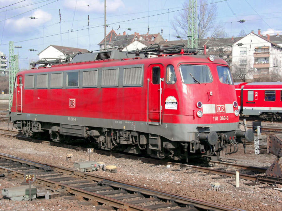| 110 359 mit Aufkleber "3-Löwen-Takt" am 04.03.1003 am Prellbock an der westlichen Seite des Hbf. Heidelberg. | |