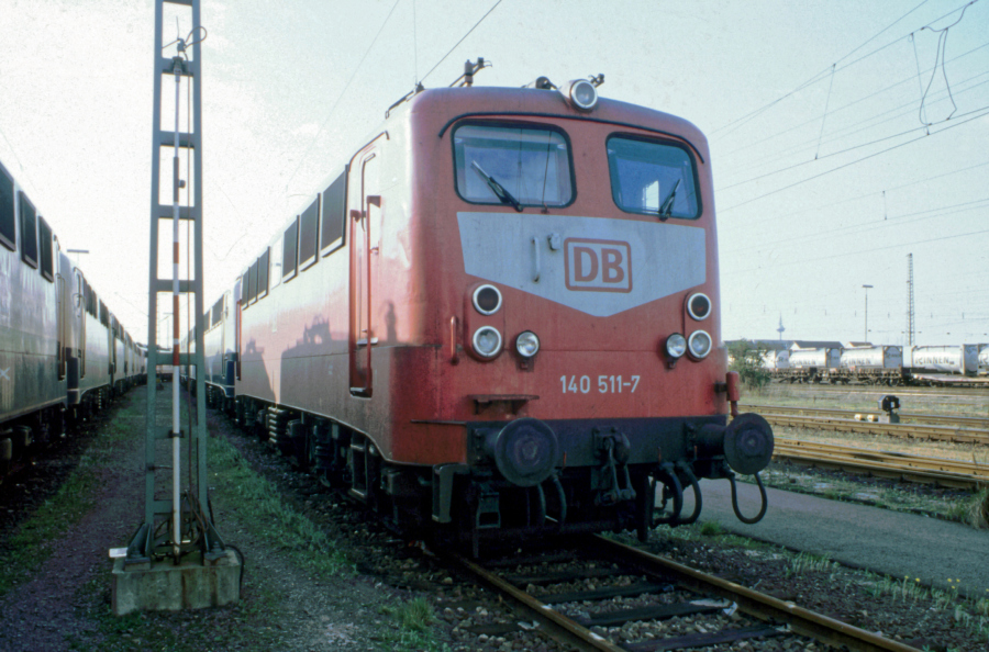 | Die damals noch in Mannheim beheimatete 140 511 in orientroter Lackierung steht am 14.04.1995 in ihrem Heimat-Bw. | |