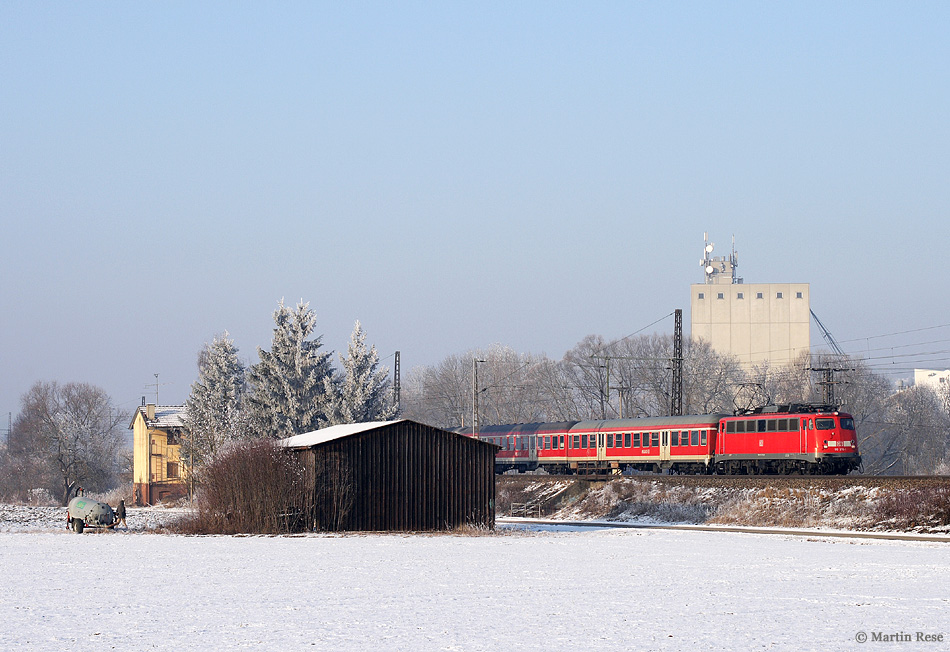| Nur Buchmäßig war die 110 376 in die Baureihe 115 umgezeichnet worden. Anfang 2009 wurde die Lok vom Bw München aus im 440-Ersatzverkehr eingesetzt. Nahe Donauwörth fährt die 110 376 mit der RB37383 aus Ulm nach Regensburg. 12.1.2009 | |
