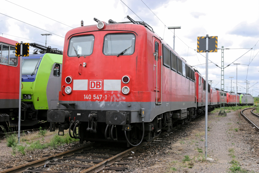 | Eine "bunte" Vielfalt an Loks und Baureihen als Nachbarn hatte die verkehrsrote 140 547 am 04.07.2004 im Bw. Mannheim. | |