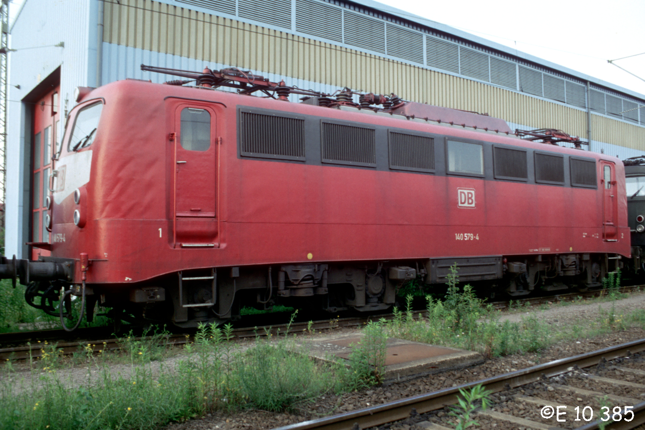 | 140 579 in orientroter Lackierung, am 22.06.2000 abgestellt im westlichen Abstellbereich des Bw. Mannheim. | |