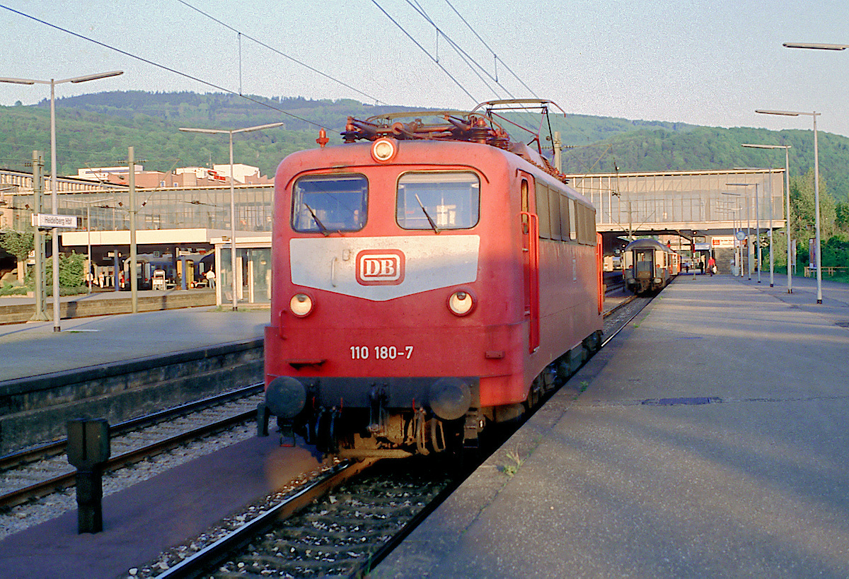 in orienroter Lackierung hat im Hbf. Heidelberg gerade von einem D-Zug abgekuppelt.