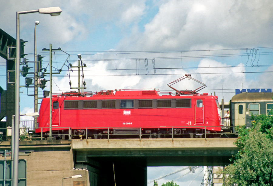 | 110 208 noch in leuchtendem Orientrot am 01.07.1990 auf der Mannheimer Rheinbrückenauffahrt in Richtung Ludwigshafen. | |