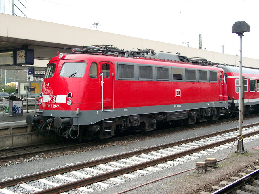 | 110 438 steht am 10.04.2003 mit einem Nahverkehrszug auf Gleis 7 im Hbf. Mannheim zur Weiterfahrt nach Heidelberg. | |