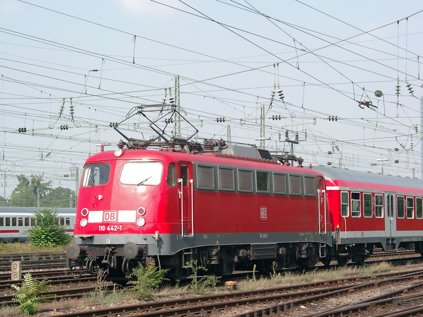 | 110 442 mit Nahverkehrszug am 14.08.2002 aus Richtung Heidelberg kurz vor der Einfahrt in den Mannheimer Hbf. | |