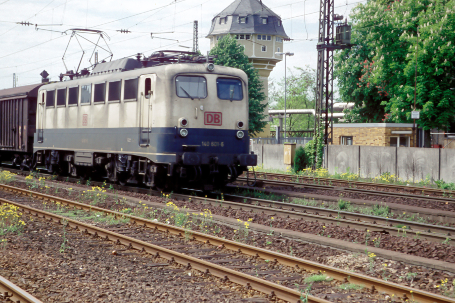 | 140 601 am 11.05.1997 auf der Durchfahrt durch den Hbf. Weiheim in Richtung Darmstadt vor dem Hintergrund des historischen Wasserturms der Firma Freudenberg. | |