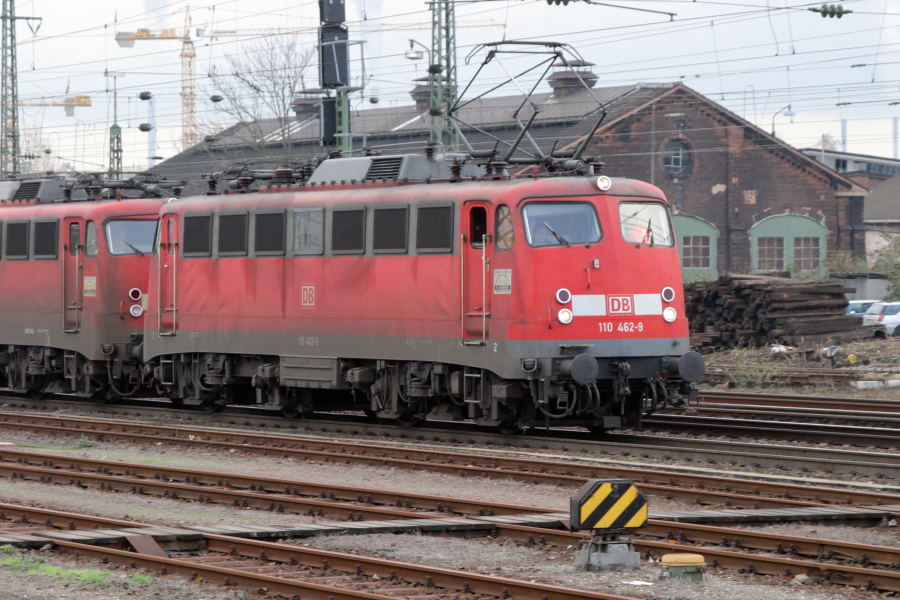 | 110 462 durchfährt am 10.12.2006 mit einer weiteren 110er den Hbf. Mannheim. Die Lok trägt noch den Aufkleber "3-Löwen-Takt". Im Hintergrund ist ein ehemaliger Lokschuppen aus den 1870er-Jahren sichtbar, den letzten erhaltenen Gebäudeteilen des alten Mannheimer Bahnhofs, der heute wieder mit anderer Funktion "zum Leben" erweckt wurde. | |