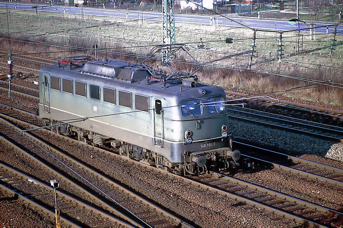| Weit entfernt von ihrem Heimat-Bw. Hamburg 1 hat sich die grüne 140 794 am 09.01.1988 im Rbf. Mannheim. Noch im gleichen Jahr wurde sie orientrot umlackiert. | |