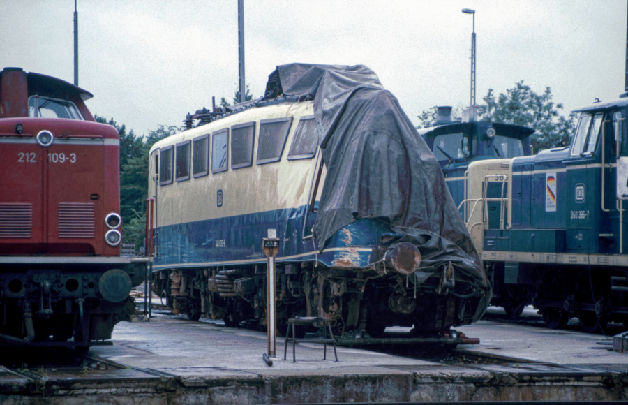 | Ein wahrhaft trauriger Anblick: Die beim Unfall am Heiligenbergtunnel stark beschädigte 140 633 steht am 24.07.1988 abgedeckt im Bw..Kaiserslautern. | |
