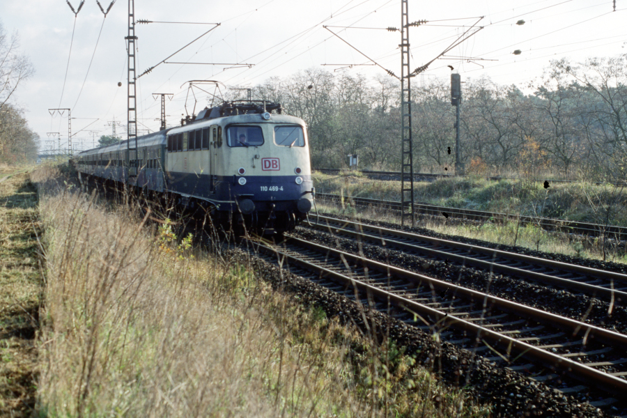 Bei einem Spaziergang im "Rheinauer Wald", einem der größten Waldgebiete bei Mannheim, kam uns, kurz vor dem Gelände des Rangierbahnhofs, am 27.11.1999 die 110 469 mit einem Nahverkehrszug auf der Fahrt von Heidelberg nach Mannheim entgegen. | |
