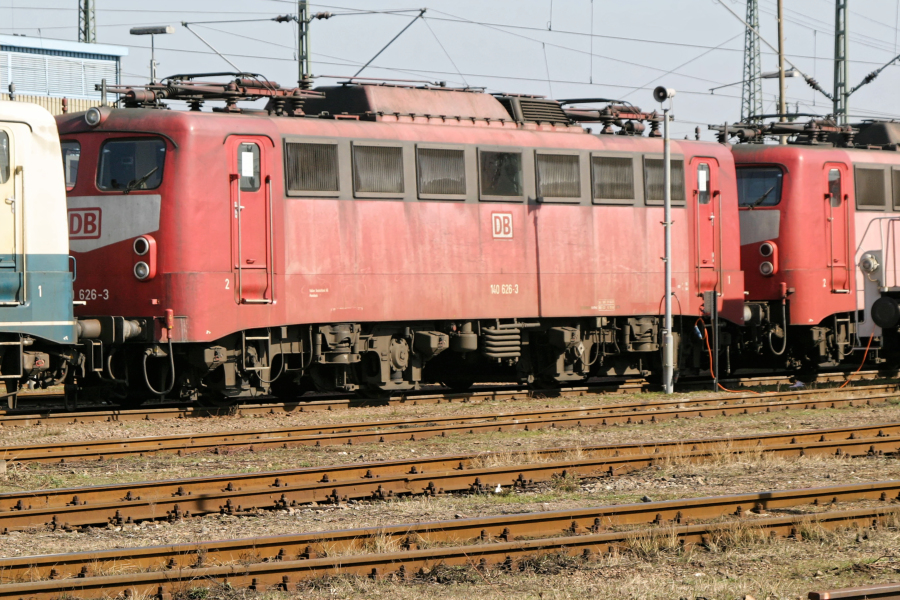 | Einen ziemlicher "Flickenteppich" bot am 18.03.2005 die Ansicht der orientroten 140 626 in ihrem letzten Heimat-Bw, Mannheim. Zu diesem Zeitpunkt war die 1967 von Krupp gebaute und noch unter der Nummer "E 40 626" für das Bw. Bebra zugelassene Fahrzeug nach 38 Einsatzjahren bereits z-gestellt und wurde kurze Zeit später ausgemustert und zerlegt. | |