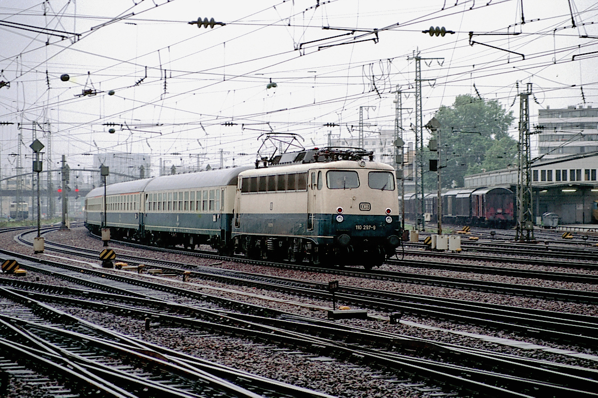 | Als Schublok für ihren D-Zug nähert sich, aus Heidelberg kommend, die 110 297 am 02.08.1987 dem Hbf. Mannheim | |