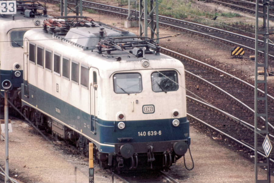 | "Besuch beim Nachbarn": Die bis zu ihrer Ausmusterung 2002 blau/beige lackierte 140 639 vom Bw. Seelze steht am 26.05.1994 im Bw. Mannheim. | |