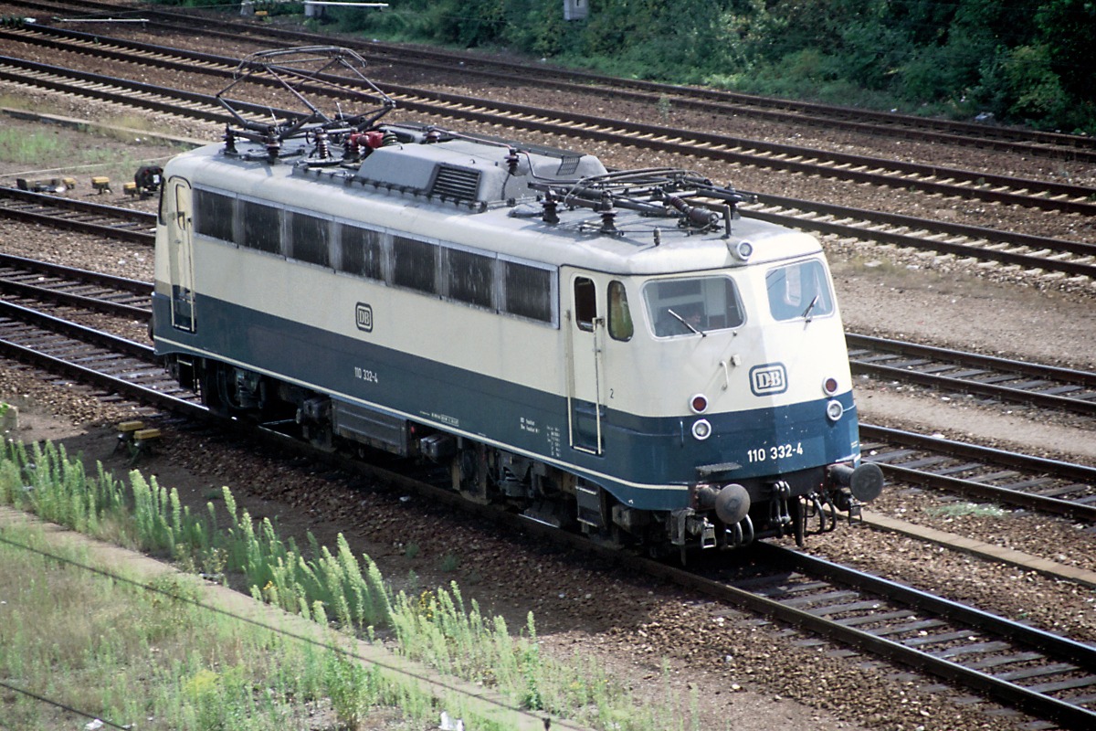 | Fast schon 37 Jahre alt ist diese Aufnahme der blau/beigen 110 332 mit ihrem alten DB-Logo am 02.10.1983 von einer Brücke aus westlich des Hbf. Mannheim. | |