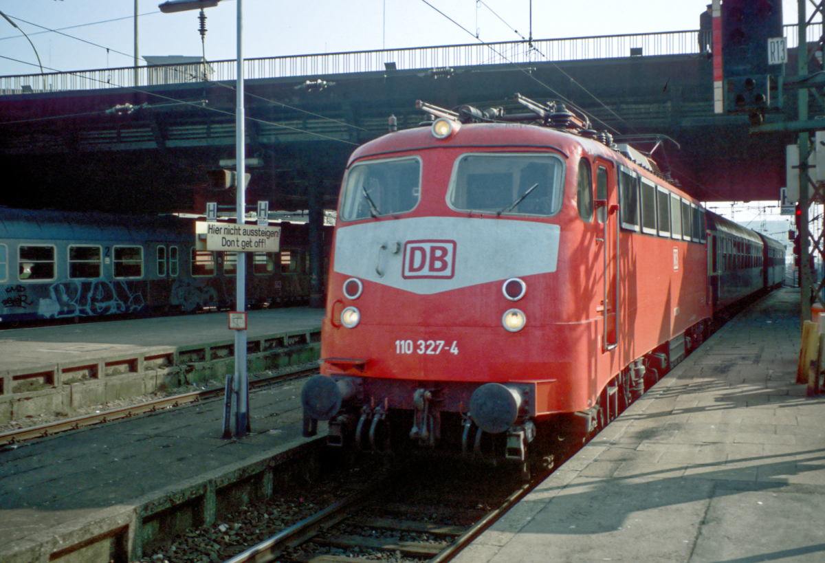 | Die in Hamburg-Eidelstedt stationierte 110 327 in orientroter Lackierung am 20.03.1996 mit einem Nahverkehrszug bei der Einfahrt in den Hbf. Hamburg. | |